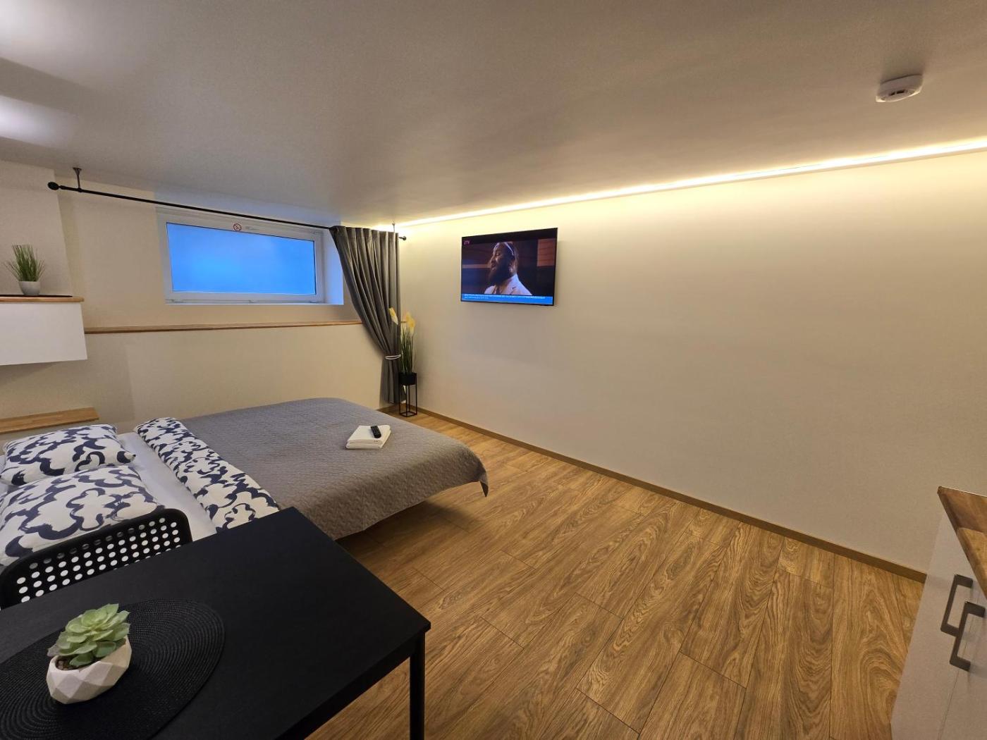 One-Bedroom Apartment. This apartment comes with 1 bedroom, a kitchen and 1 bathroom with a shower and a hairdryer. Guests can make meals in the kitchen that features a stovetop, a refrigerator, a microwave and an electric kettle. This apartment has a dining area, heating and a flat-screen TV with cable channels. The unit has 1 bed.