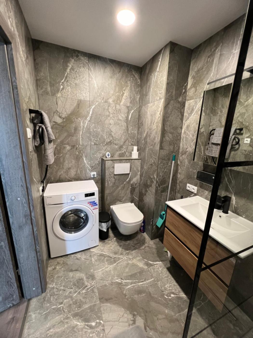 Studio Apartment with One Double Bed. Boasting a private entrance, this apartment comes with 1 living room, 1 separate bedroom and 1 bathroom with a walk-in shower and a hairdryer. In the well-equipped kitchen, guests will find a stovetop, a refrigerator, kitchenware and a microwave. The apartment has parquet floors, a seating area with a flat-screen TV, a washing machine, soundproof walls as well as city views. The unit has 2 beds.