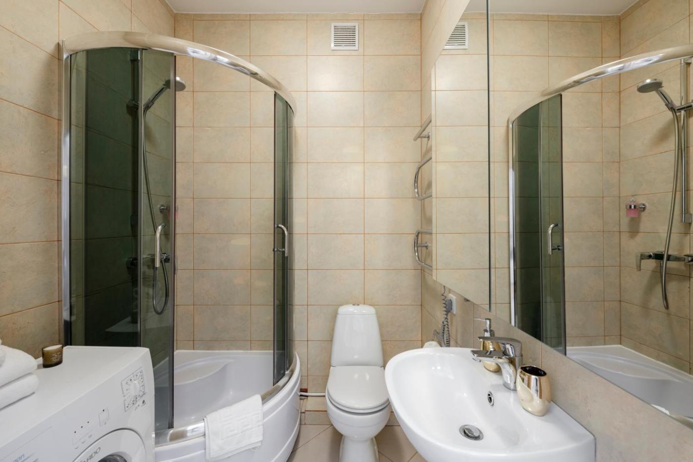 Luxury Studio. An apartment offers king-size bed and spacious sitting area. Luxury studio has a private bathroom which also includes washing machine, iron and ironing desk. In addition, there is a full kitchen withnecessary supplies such as: toaster, microwave and fridge. ;
